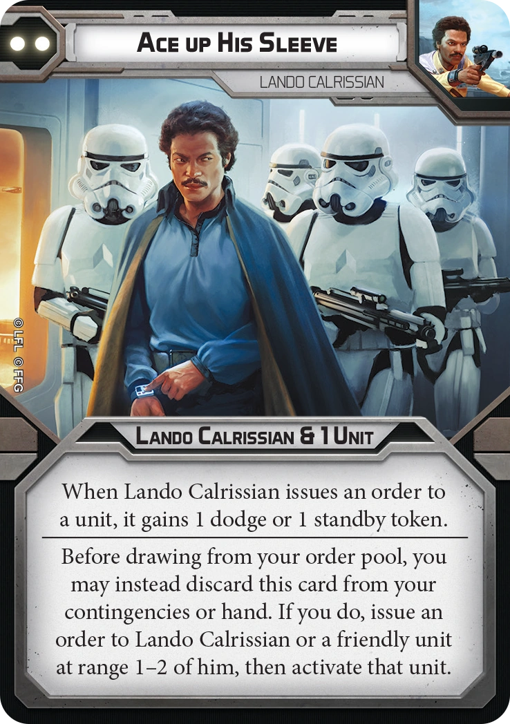 Before drawing from your order pool, you may instead discard this card from your contingencies or hand. If you do, issue an order to Lando Calrissian or a friendly unit at range 1-2 of him, then acdtivate that unit.