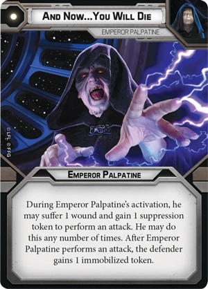 During Emperor Palpatine's activation, he may suffer 1 wound and gain 1 suppression token to perform an attack. He may do this any number of times. After Emperor Palpatine performs an attack, the defender gains 1 immobilized token.