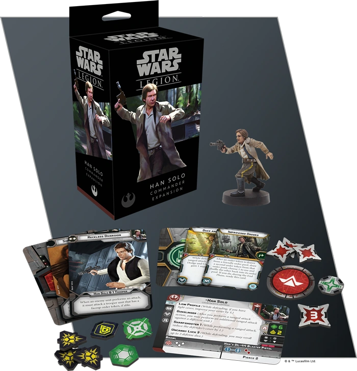"Within the Han Solo Commander Expansion, Rebel leaders will find everything they need to add Han Solo as a commander to their Star Wars: Legion armies. A single unpainted, easily assembled miniature features Han Solo with his DL-44 heavy blaster pistol drawn and ready to fire. Three new upgrade cards give you the tools to outfit Han Solo or another unit for battle, and three command cards let you bring Han’s trademark daring and braggadocio to the field. Releasing alongside the Rebel Commandos Unit Expansion, these two expansions let you create your own battles on Endor or any other planet from the Star Wars galaxy."