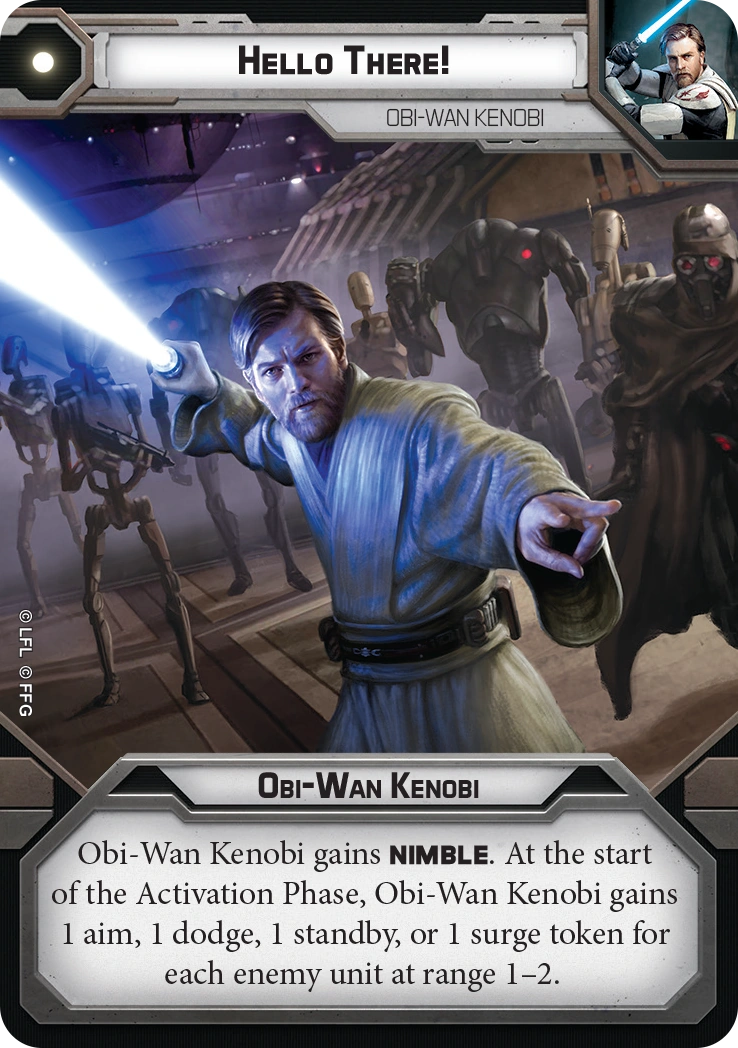 Obi-Wan Kenobi gains Nimble. At the start of the Activation Phase, Obi-Wan Kenobi gains 1 aim, 1 dodge, 1 standby, or 1 surge token for each enemy unit at range 1-2.